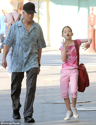 Healthy: Michael Douglas looked happy and fit as he walked daughter Carys to school this weekHe was given the all-clear from his throat cancer battle in January.